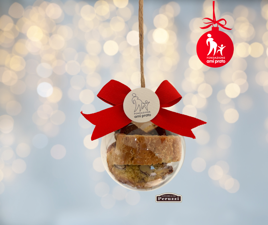 Pallina di natale trasparente con all’interno cantucci di Prato realizzati dalla Pasticceria Peruzzi.
